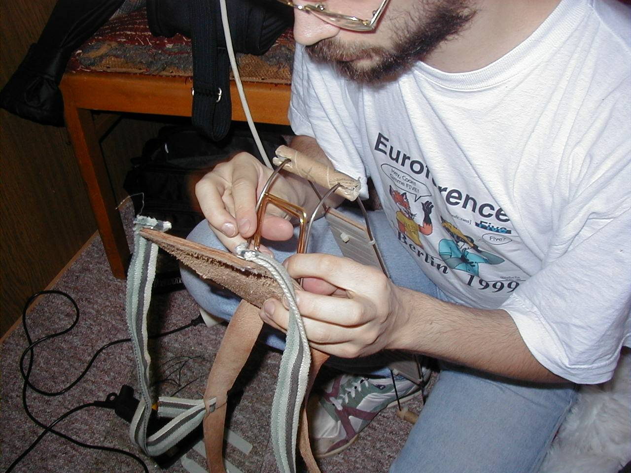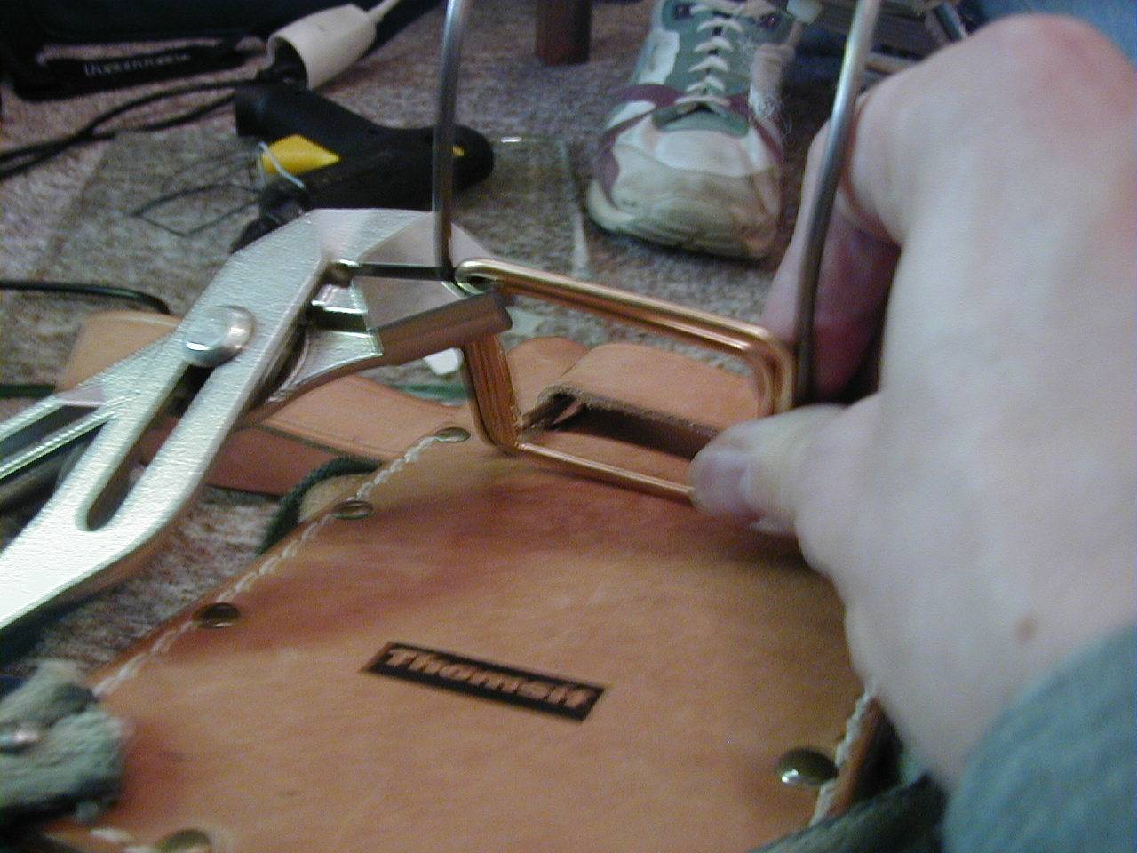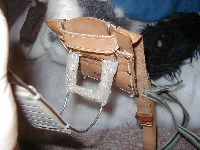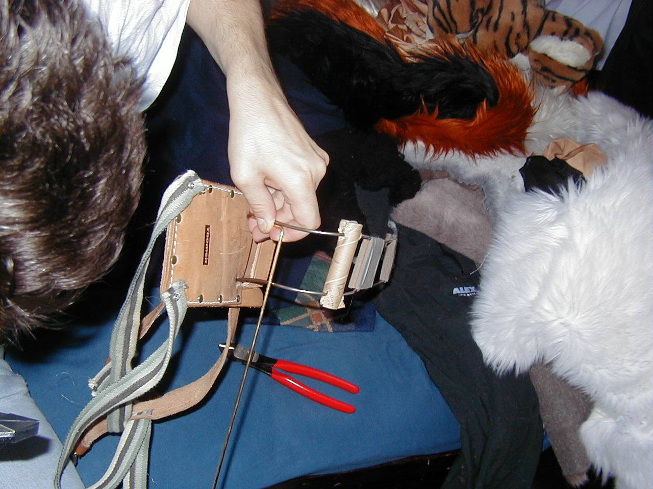 Tail Construction As you can see here the basic construction was mainly a leather belt with a leather pad and two thick copper wires. Building the brace like this was sufficient, until I stuffed the tail with plush wool for stuffed animals. Afterwards the constuction wasn't able to hold the tail upright anymore. A new solution had to be found.